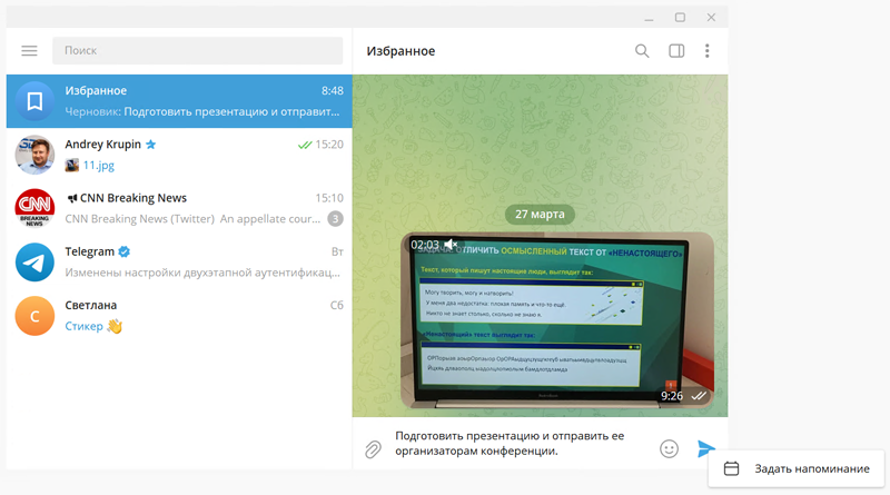 Graças ao espaço pessoal “Favoritos” e à função de mensagens atrasadas integrada do Telegram, você pode usar o mensageiro para planejar tarefas e enviar lembretes sobre eventos futuros. Basta escrever uma mensagem de lembrete na janela “Favoritos”, clicar com o botão direito do mouse no botão “Enviar” e definir a data e hora para o envio da notificação correspondente. Desta forma você pode criar lembretes para tarefas, reuniões, eventos e outras coisas.