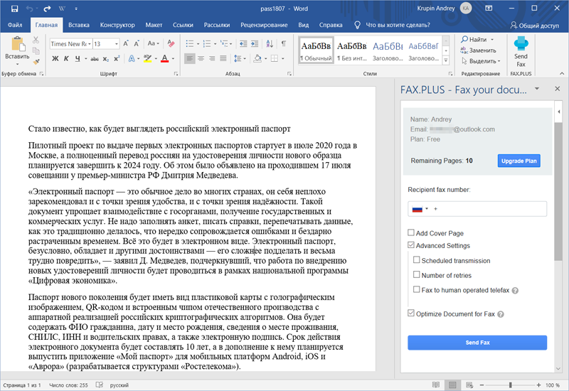 Apesar de sua idade venerável, a comunicação por fax ainda é usada em algumas empresas que preferem soluções confiáveis e testadas ao longo do tempo para transmissão de dados. Nesses casos, o Word com extensão Fax.Plus, que adiciona a função de envio de fax para um editor de texto, pode atender bem aos funcionários de escritório. Suporta envio de documentos para mais de 180 países e envio de dados programados. A transferência de dados é realizada através do serviço de Internet com o mesmo nome, portanto não há necessidade de adquirir e conectar um fax modem ao seu computador.