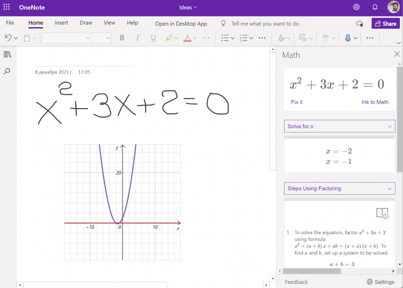 O OneNote pode ser usado não apenas para fazer anotações rápidas e organizar informações pessoais, mas também para resolver problemas matemáticos que são frequentemente encontrados por estudantes do ensino médio, estudantes de engenharia e engenheiros cujas atividades profissionais envolvem a realização de diversos cálculos. Basta digitar ou escrever à mão a equação na janela do OneNote, usar a ferramenta Laço para selecionar o texto inserido e pressionar a tecla Matemática. Como resultado, o aplicativo fornecerá uma resposta e uma solução detalhada e passo a passo do problema, que, se necessário, pode ser complementada com gráficos de funções algébricas e trigonométricas em coordenadas bidimensionais e tridimensionais. A resolução de equações matemáticas está disponível apenas no Microsoft 365, a versão de assinatura do Microsoft Office.