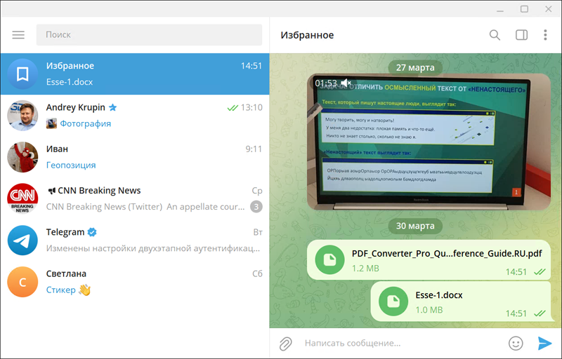 O serviço Telegram oferece ao usuário um grande número de funções, inclusive aquelas que vão além das comunicações comuns. Um exemplo marcante disso é a já citada possibilidade de utilizar o messenger para armazenar arquivos em armazenamento em nuvem, cujo volume é ilimitado. O acesso a esta função é fornecido pelos “Favoritos” (Mensagens Salvas na versão em inglês da interface) – uma pasta especial projetada para armazenar informações pessoais que são visíveis apenas para o proprietário da conta. Em “Favoritos” você pode armazenar notas de texto, documentos, fotos, vídeos, cópias de mensagens encaminhadas e outros conteúdos que podem ser acessados de qualquer dispositivo. Você pode fazer upload de arquivos de até 2 GB e, se tiver uma assinatura do Telegram Premium – até 4 GB sem restrições na velocidade de transferência de dados.