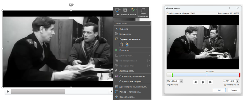 O programa de apresentação PowerPoint também pode ser usado como um simples editor de vídeo com a função de remover frames desnecessários. Para fazer isso, você precisa inserir um arquivo de mídia no slide, clicar com o botão direito sobre ele, selecionar “Cortar” e realizar as ações necessárias na janela da ferramenta de edição de vídeo. O arquivo finalizado pode então ser salvo em um disco do PC. Nota importante: você só pode cortar vídeos inseridos no seu computador. Esta função não está disponível para vídeos emprestados da Internet.