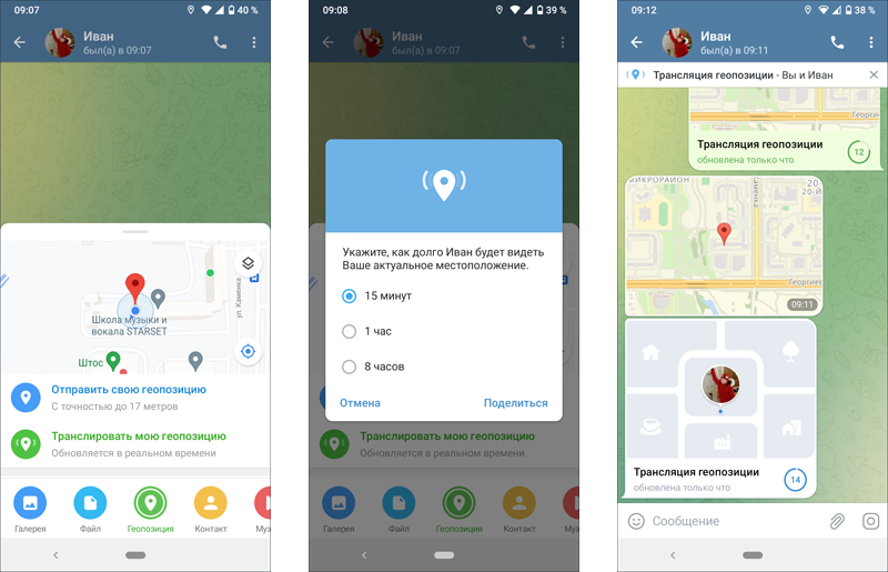 Usando o aplicativo móvel Telegram, você pode compartilhar suas coordenadas com entes queridos, amigos e colegas em tempo real. Isto é útil, por exemplo, para pais que estão preocupados com a segurança dos seus filhos. Além disso, a transmissão de geolocalização será útil para usuários que precisam acompanhar parentes idosos e determinar a localização de seus familiares. Para ativar esta função, você precisa clicar no ícone do clipe de papel no campo de entrada da mensagem e selecionar “Geolocalização → Transmitir minha geolocalização”.