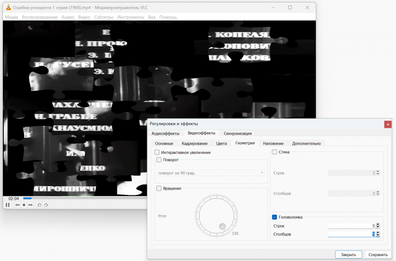 Quem gosta de passar o tempo resolvendo vários tipos de quebra-cabeças e quebra-cabeças lógicos certamente vai gostar da função “Quebra-cabeça” implementada no media player VLC, que está localizada no menu “Ferramentas → Efeitos e filtros → Efeitos de vídeo”. Se você ativá-lo, o vídeo reproduzido será dividido em vários fragmentos de mosaico que precisam ser reunidos em um único todo. A dificuldade do jogo pode ser ajustada aumentando as linhas e colunas que compõem o quebra-cabeça. Os elementos do quebra-cabeça são movidos com o mouse.