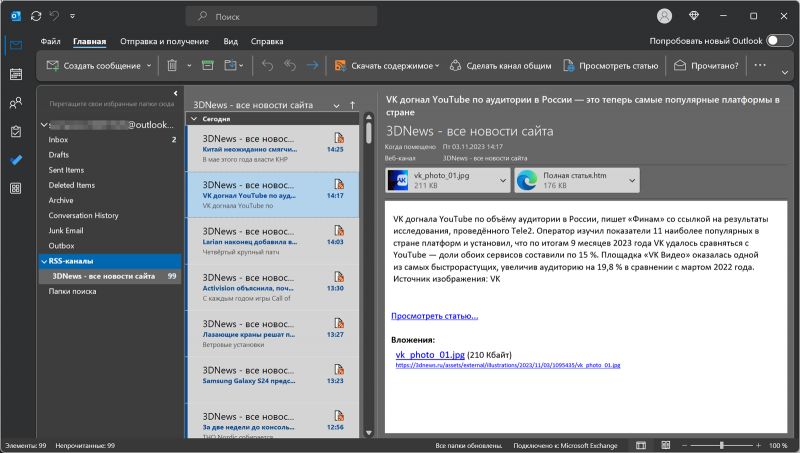 Muitas vezes acontece que se você tiver um conjunto completo de aplicativos Microsoft Office/Microsoft 365 em seu computador, apenas o editor de texto Word, o processador de planilhas Excel e o programa de apresentação PowerPoint são comumente usados, enquanto o comunicador Outlook com as funções de um cliente de e-mail fica parado. Enquanto isso, esta ferramenta pode ser usada como um simples agregador RSS para assinar atualizações de vários recursos de rede e receber prontamente feeds de notícias, anúncios de artigos, mudanças em blogs, etc. .