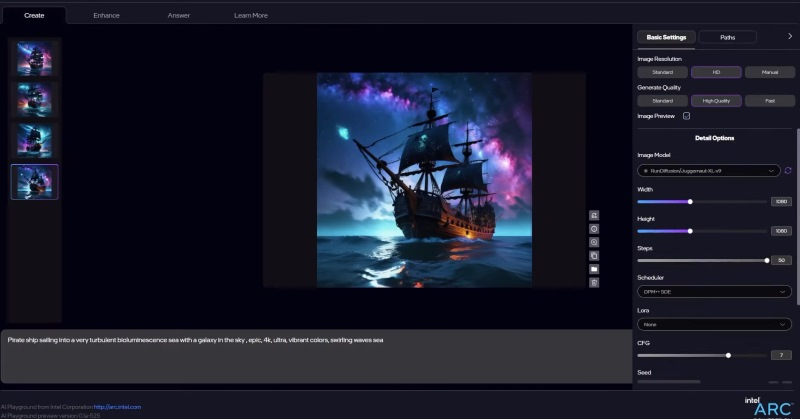 AI Playground é instalado em seu computador como um aplicativo padrão do Windows. A interface do usuário parece bastante simples. Para interagir com diferentes funções, como gerar ou editar uma imagem, recomendamos alternar entre as guias na parte superior da área de trabalho. Para criar uma imagem, basta inserir um texto descritivo e iniciar o processo de geração. A capacidade de alterar a qualidade e a resolução da imagem é suportada; existem opções adicionais que podem ser úteis durante a edição;