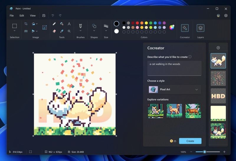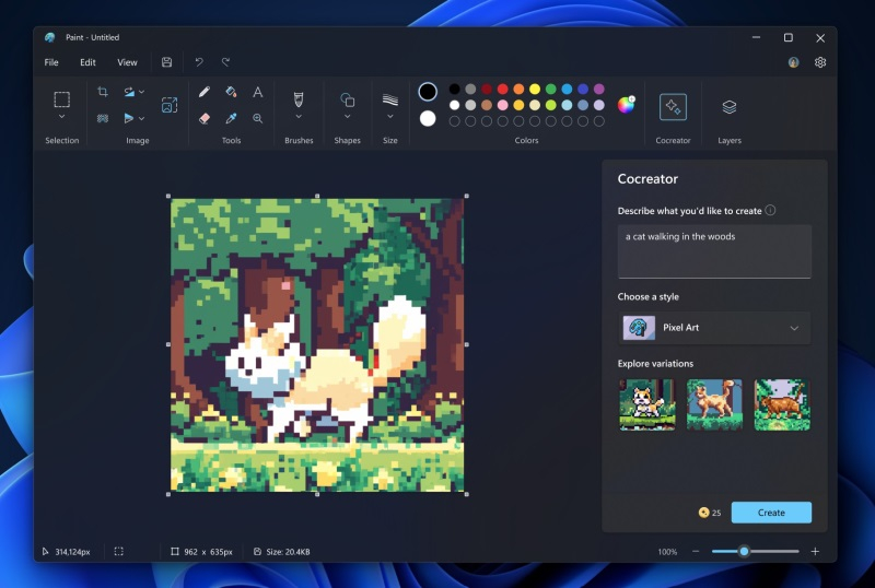 Esta semana, a Microsoft lançou mais uma versão beta do editor gráfico Paint para Windows 11. Entre outras coisas, ele implementa a função Cocreator AI, que pode ser usada para gerar imagens com base em uma descrição de texto. O aplicativo agora está disponível para membros do Windows Insider nos canais Dev e Canary.