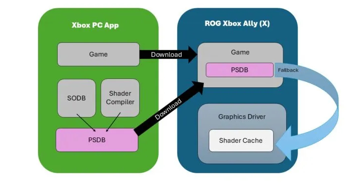 A empresa coleta dados de shader do jogo e os empacota no SODB. Os desenvolvedores do DirectX trabalharam com fabricantes de placas de vídeo para desenvolver um método de separar o compilador de shader do driver gráfico, o que permitiu sua combinação com o SODB e a criação de um banco de dados de shader pré-compilado (PSDB). Ao carregar um jogo por meio do aplicativo para Xbox, o aplicativo detecta a configuração do sistema do usuário e obtém o PSDB apropriado. Assim, ao iniciar o jogo pela primeira vez, o aplicativo detecta os shaders pré-instalados e ignora o longo processo de compilação.