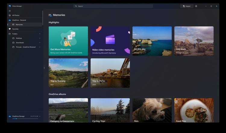 Suporta a capacidade de trabalhar com várias janelas e telas, bem como importar imagens de fontes externas, como um smartphone ou câmera. Os usuários também podem visualizar o espaço disponível do OneDrive diretamente do aplicativo Fotos e expandi-lo conforme necessário. O novo aplicativo não possui funcionalidade de edição de vídeo. Para interagir com clipes, a Microsoft recomenda usar o editor de vídeo Clipchamp.