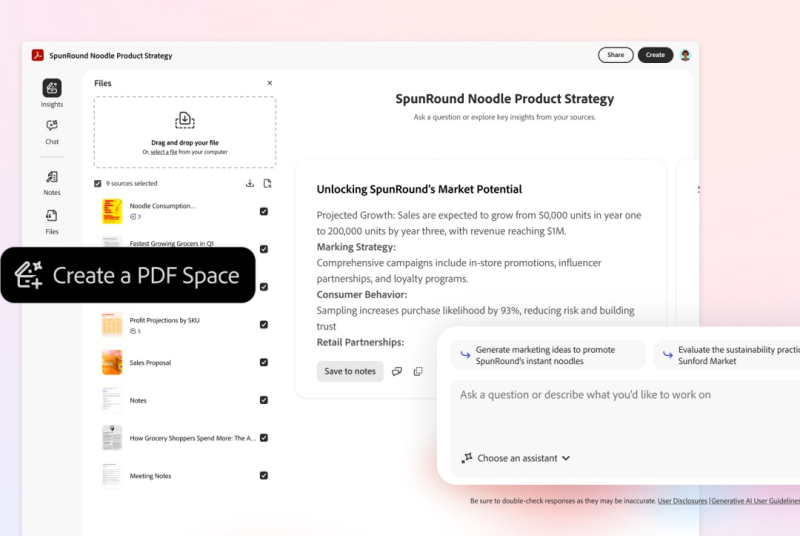 A visão da Adobe é transformar o Acrobat de um leitor e editor de PDF em uma plataforma compatível com uma ampla gama de tipos de arquivos e ferramentas de produtividade, incluindo páginas da web e arquivos do Microsoft 365. A plataforma permite que os usuários trabalhem em vários documentos simultaneamente sem sair do Acrobat, usando ambientes colaborativos chamados PDF Spaces, que reúnem informações de arquivos e sites em “centros de conhecimento para conversas”.