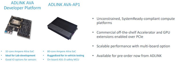 Para a parte de software, foram anunciadas duas plataformas de hardware de referência, criadas em parceria com Ampere e ADLink. A versão básica é chamada de AVA Developer Platform, é equipada com um processador de 32 núcleos e foi projetada para desenvolvimento de software em laboratório – o desempenho é suficiente para testar a carga de trabalho. Se necessário, o fabricante da versão comercial poderá complementar a plataforma com um acelerador de hardware.
