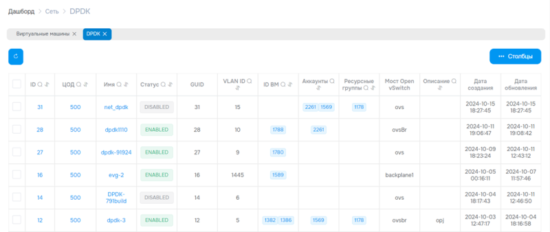 O Dynamix Enterprise atualizado implementa suporte à tecnologia DPDK, e o tipo de conexão de rede de mesmo nome para máquinas virtuais (VM) no sistema operacional Ubuntu ficou disponível. Alterações relacionadas foram feitas na interface da solução: uma página com uma lista de redes DPDK e uma página com as características e configurações de uma rede DPDK específica foram adicionadas. Além disso, as caixas de diálogo para criar uma VM, conectar uma interface a uma VM, etc. foram complementadas com itens exigidos pelo administrador.