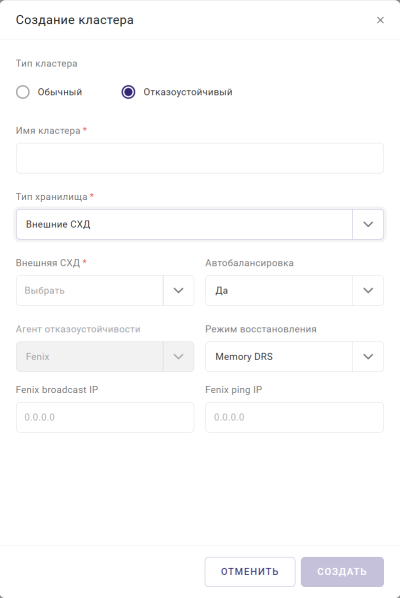 Para melhorar a tolerância a falhas do sistema de armazenamento, foi adicionado um modo de recuperação de VM baseado na disponibilidade de RAM livre (Memory DRS). Se você selecioná-lo durante a criação do cluster, a VM será transferida se um dos servidores do cluster falhar para servidores que permanecem operacionais, levando em consideração a memória livre disponível neles. O servidor de destino será selecionado de forma que o cluster esteja balanceado de maneira ideal após a conclusão da migração.