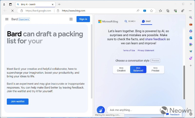 A mensagem contém um link, após clicar no qual o espaço de trabalho do navegador é dividido em duas partes. Tal interface permitirá ao usuário interagir simultaneamente com os bots Bard e Bing AI, comparando seu trabalho online. Segundo a fonte, a inovação mencionada apareceu em versões beta do Edge, mas ainda não se sabe se será integrada em versões estáveis do navegador.