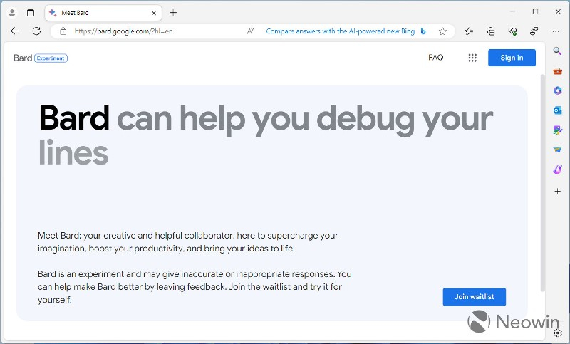 Aparentemente, a Microsoft está testando uma nova forma de promover seu bot de IA na tentativa de distrair os usuários de usarem uma ferramenta similar aos concorrentes. Segundo relatos, ao acessar bard.google.com usando o navegador Edge, uma mensagem aparece no lado direito da barra de endereço: “Compare as respostas com o novo Bing com tecnologia AI”.