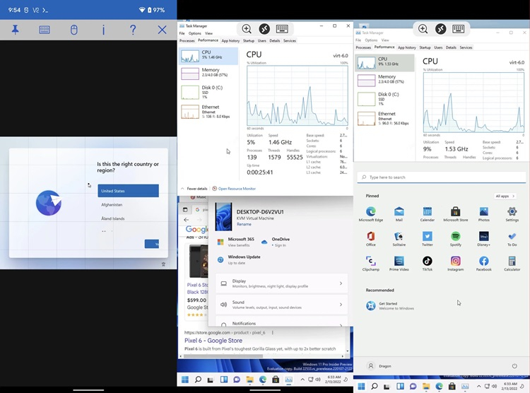 Segundo relatos, o kdrag0n testou com sucesso várias distribuições Linux no smartphone Pixel 6, que foram lançadas graças ao novo hipervisor KVM no Android 13. Segundo ele, essa abordagem oferece um bom nível de desempenho. O entusiasta não parou por aí e conseguiu rodar a versão ARM do Windows 11 em um smartphone usando o mesmo hipervisor KVM.