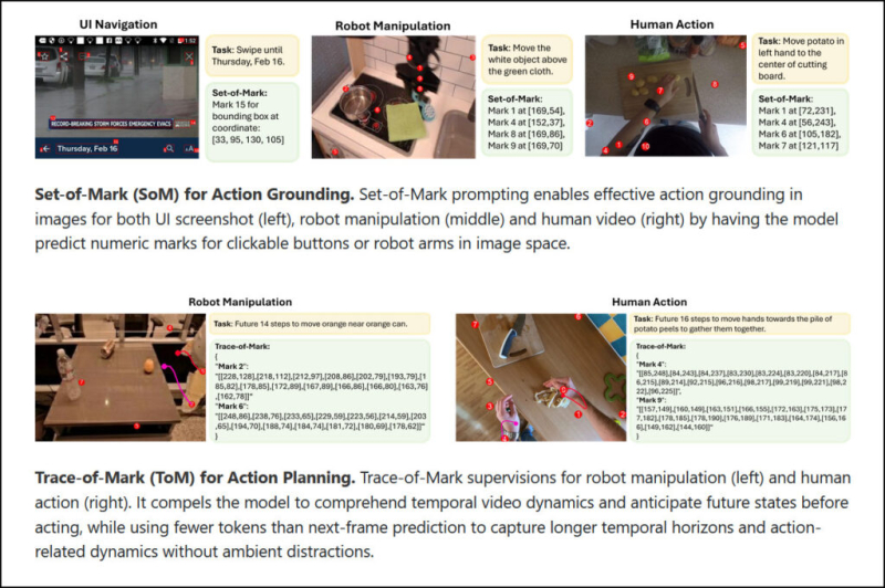 O modelo de IA da Magma inclui dois componentes técnicos: Conjunto de Marcas (identifica objetos manipuláveis em um ambiente atribuindo rótulos digitais a elementos interativos, como botões pressionáveis em uma interface de usuário ou objetos agarráveis no espaço de trabalho de um robô) e Rastreamento de Marcas (permite que o algoritmo execute tarefas como navegar em interfaces de usuário ou controlar braços robóticos para agarrar e mover objetos).