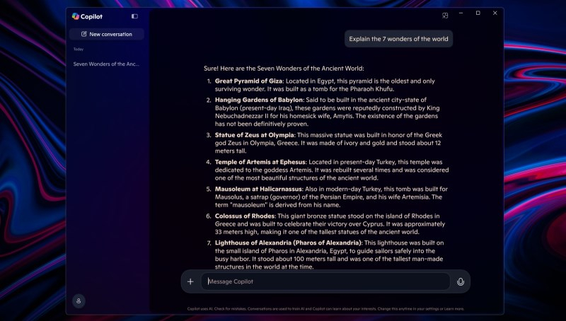 A boa notícia é que a atualização não removeu nenhum dos recursos disponíveis anteriormente no aplicativo. Você ainda pode interagir com o Copilot via chat de texto. O histórico de bate-papos dos usuários é salvo na barra lateral, para que você possa continuar trabalhando com o algoritmo a qualquer momento. Para iniciar um novo bate-papo, basta clicar no botão correspondente.