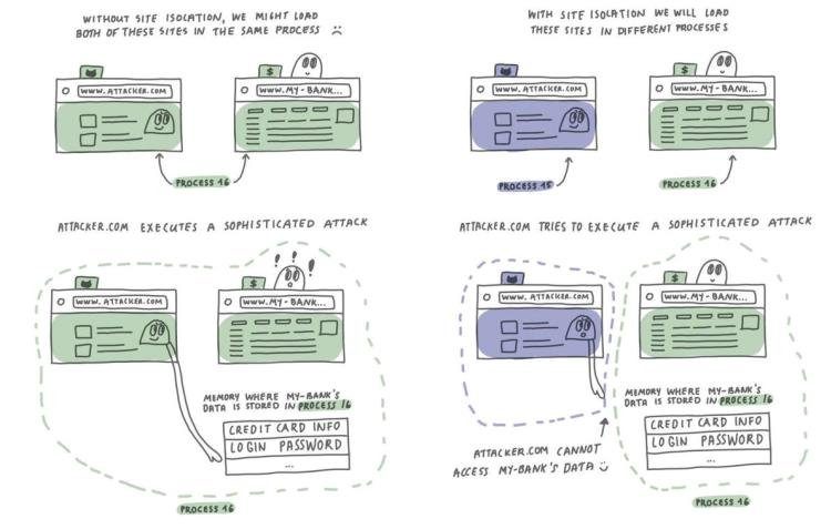 Para um determinado número de processos, é possível que vários sites sejam executados no mesmo processo de sistema operacional. Um desses sites pode ser um recurso malicioso. Trabalhando em um processo, os sites usam memória compartilhada, o que significa que um recurso malicioso tem a capacidade de acessar dados de outros sites no mesmo processo.