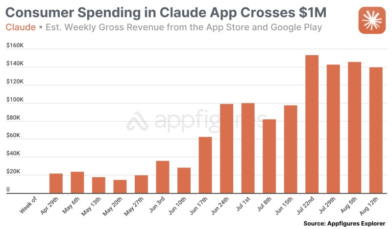 Demorou 16 semanas, mas o aplicativo de IA da Anthropic, Claude, ultrapassou um marco importante: ultrapassou US$ 1 milhão em receita de aplicativos móveis para iOS e Android. De acordo com a empresa de análise de aplicativos móveis Appfigures, quase metade da receita de Claude veio de usuários dos EUA.