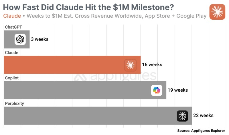 Apesar disso, os desenvolvedores de Claude conseguiram obter o primeiro milhão em receitas mais rapidamente do que outros concorrentes que promovem aplicações de IA. Embora Claude esteja significativamente atrás do ChatGPT, que levou apenas três semanas para atingir US$ 1 milhão em receita, ele ultrapassou o Copilot e o Perplexity da Microsoft, que alcançaram o mesmo feito 19 e 22 semanas após o lançamento, respectivamente.