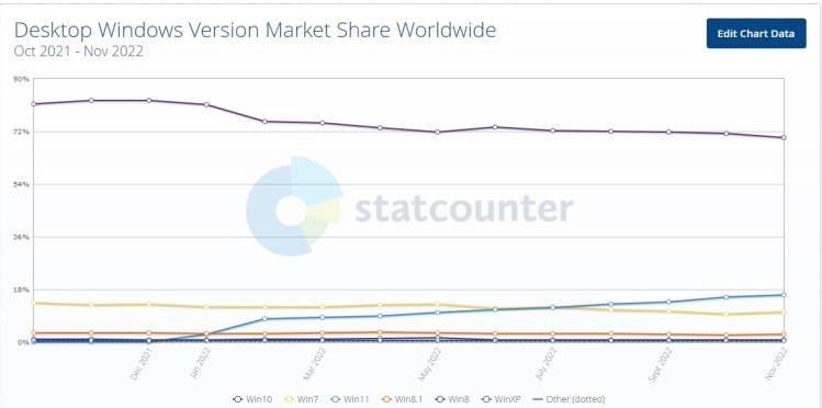 Segundo o StatCounter, em novembro deste ano, a participação do Windows 10 caiu para 69,77%, ou seja, 1,49 p.p. menor do que em outubro. Embora o Windows 10 esteja gradualmente perdendo terreno para o Windows 11, isso está acontecendo lentamente, pois muitos usuários não têm pressa em atualizar para a versão mais recente do sistema operacional, lançada oficialmente há mais de um ano. Ao mesmo tempo, o Windows 11 não bate nenhum recorde em termos de velocidade de distribuição, mas continua aumentando gradativamente sua própria presença. Em novembro deste ano, o Windows 11 era usado em 16,12% dos dispositivos, alta de 0,67 p.p. mais do que no mês anterior.