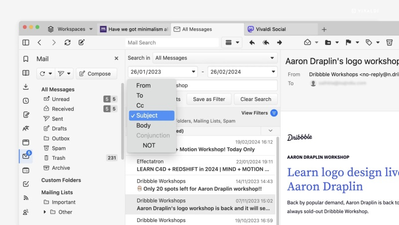O cliente de e-mail agora possui meios avançados de busca de mensagens usando diversos critérios. Se necessário, a pesquisa configurada pode ser salva como um filtro, pelo que futuramente a correspondência recebida será automaticamente ordenada em pastas.