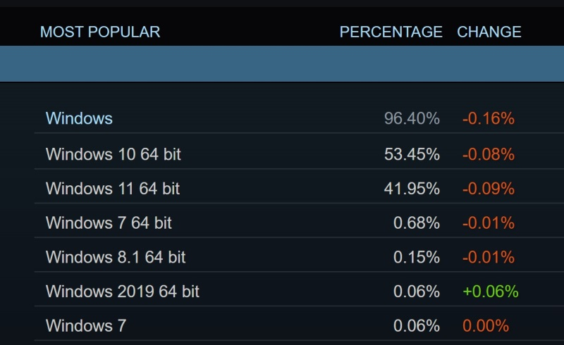 Tal como acontece com as versões anteriores do Windows, o principal motivo pelo qual o Windows 10 continua a ser popular são os negócios. De acordo com a plataforma Steam, o Windows 10 vem perdendo terreno lenta mas seguramente para o Windows 11 há vários meses e, no momento, a diferença entre eles é de apenas 11%. O Windows 11 quase certamente continuará a superar o Windows 10 este ano. No entanto, também é importante que mais da metade dos usuários do Steam ainda executem o Windows 10.