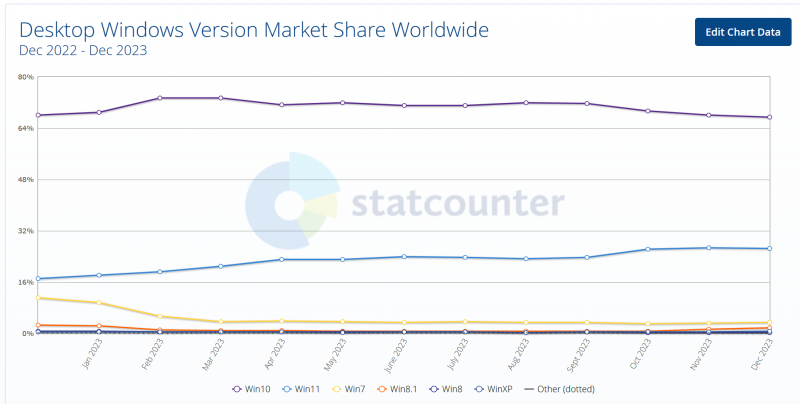 Segundo cálculos do Statcounter, o Windows 10 encerrou 2023 com uma participação de 67,42%, enquanto um ano antes este sistema operacional era usado em 67,95% dos computadores Windows. Isso significa que a adoção do Windows 10 permaneceu praticamente inalterada nos últimos doze meses, apesar dos esforços da Microsoft para incentivar os usuários a atualizarem para o Windows 11. Embora a participação deste último tenha crescido 10% ao longo do ano, a adoção do novo sistema operacional não é indo tão rápido quanto a gigante do software gostaria. Em dezembro de 2023, o Windows 11 estava instalado em pouco mais de um quarto dos PCs em todo o mundo.