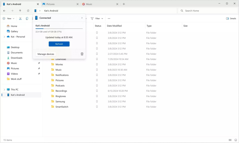 Depois que todos os componentes necessários forem atualizados, os usuários poderão gerenciar arquivos sem fio em seus dispositivos Android diretamente do Windows Explorer por meio de uma conexão Wi-Fi – sem necessidade de conexão USB. Os usuários do Windows verão seus telefones Android como um atalho na barra lateral do File Explorer.