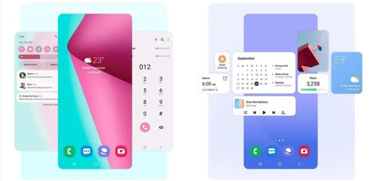 Muitos dos recursos que apareceram no One UI 4 são amplamente familiares aos usuários após as atualizações do Android 12. Os desenvolvedores implementaram uma nova paleta de cores no shell com base em Material You, devido ao qual o design da interface pode mudar de acordo com o que a cor prevalece no papel de parede usado. Algumas mudanças afetaram os widgets, que receberam suporte para uma personalização mais granular.