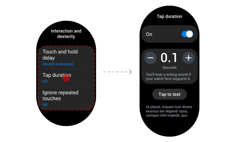 Para aqueles que precisam de ajuda com a entrada de toque, você pode aumentar a duração de um toque na tela com a configuração Duração do toque e desativar as entradas de toque repetitivas com a opção Ignorar toques repetidos. Você também pode definir por quanto tempo as opções de volume e notificação são exibidas na tela. Por fim, existem ferramentas adicionais para personalizar o mostrador do relógio inteligente.