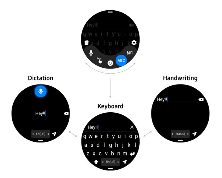 O One UI Watch 4.5 apresenta a digitação completa na tela. Independentemente de o usuário estar procurando algo na Internet ou respondendo a uma mensagem, o shell permite alternar o modo de entrada de texto a qualquer momento: por exemplo, ao começar a ditar uma mensagem, você pode terminar de digitá-la usando a tela teclado.