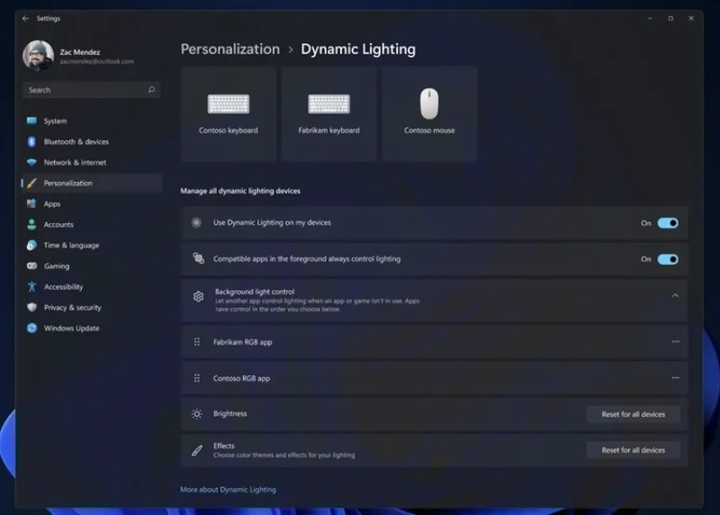Além disso, o Windows 11 possui controles de iluminação RGB integrados. A Iluminação Dinâmica permite controlar a iluminação de uma variedade de acessórios compatíveis usando o padrão aberto HID LampArray. Fabricantes de periféricos para jogos como Acer, ASUS, HP, HyperX, Logitech, Razer e Twinkly estão colaborando com a Microsoft para desenvolver esse recurso e garantir a compatibilidade dos dispositivos. Espera-se que no futuro os usuários possam controlar a retroiluminação de diferentes dispositivos através do Windows, sem recorrer a aplicativos de terceiros.