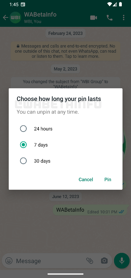 Segundo relatos, a versão beta do WhatsApp 2.23.13.11 tem uma opção com a qual você pode escolher por quanto tempo uma mensagem será fixada. A inovação pode ser usada em chats pessoais e em grupo. Nesta fase, são oferecidas aos usuários três opções de quanto tempo uma mensagem pode ser fixada: 24 horas, 7 dias e 30 dias. Supõe-se que, em última análise, o messenger permitirá que você escolha não apenas uma das opções disponíveis, mas também escolha independentemente o período durante o qual a mensagem será corrigida.