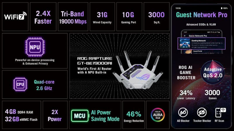O Asus ROG Rapture GT-BE19000AI é o primeiro roteador de jogos do mundo com um processador neural integrado (NPU), ou seja, um acelerador de inteligência artificial. Juntamente com a CPU e o MCU, garante a privacidade do usuário e a eficiência energética do dispositivo: software inteligente e um algoritmo de aprendizagem programado ajudam a ativar o modo de economia de energia, resultando em uma redução de 46% no consumo de energia.