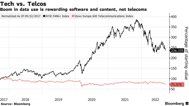 As plataformas de tecnologia dos EUA foram as principais beneficiárias do aumento de 40% no tráfego downstream e da duplicação do tráfego upstream durante a pandemia, dizem as operadoras de banda larga, enquanto as operadoras arcam com o peso do pagamento das contas. O índice de telecomunicações Stoxx 600 da Europa perdeu um quarto de seu valor nos últimos cinco anos, enquanto o índice NYSE FANG+, que acompanha as ações das principais empresas de tecnologia, mais que dobrou.