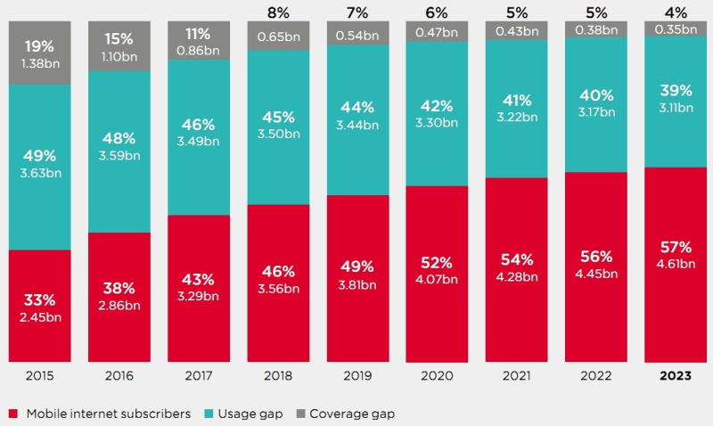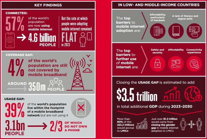 De acordo com um relatório de 93 páginas da GSM Association (GSMA), 57 por cento da população mundial, ou cerca de 4,6 mil milhões de pessoas, tinham acesso à Internet móvel até ao final de 2023, mas a taxa de crescimento está a abrandar. O número total de pessoas sem acesso à banda larga móvel é de 3,45 mil milhões, a maioria delas em países de baixo e médio rendimento. Além disso, 90% deles estão dentro da área de cobertura da rede.