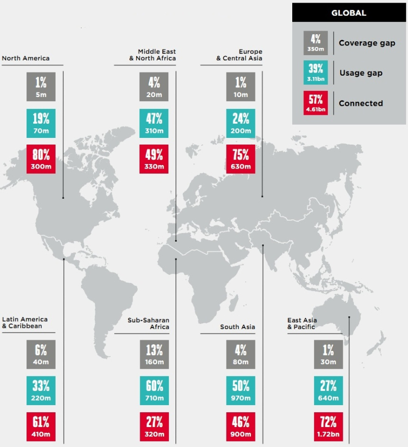 Em regiões como a América do Norte e a Europa, apenas 1 por cento da população não está coberta por nenhuma rede, enquanto aqueles que simplesmente não utilizam a Internet móvel representam 19 e 24 por cento da população nestas regiões, respetivamente.