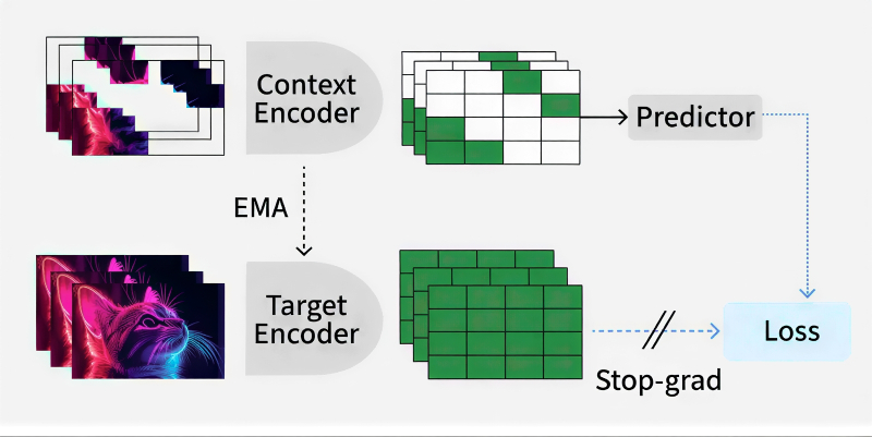 O esquema básico de treinamento do JEPA é o seguinte: o codificador de contexto processa a parte dos dados que está aberta ao sistema (o próprio contexto) e forma sua representação vetorial no espaço latente; o codificador de alvo processa a parte dos dados que o sistema precisa prever (o alvo) e forma a representação vetorial do alvo; o preditor recebe a representação vetorial do contexto e prevê a representação vetorial do alvo com base nela; em seguida, minimizando uma função de perda definida especificamente para esse fim, o modelo aprende a reduzir a distância (também no mesmo espaço latente de altíssima dimensionalidade) entre a representação vetorial do alvo prevista e a representação vetorial do alvo real (fonte: GeeksForGeeks).