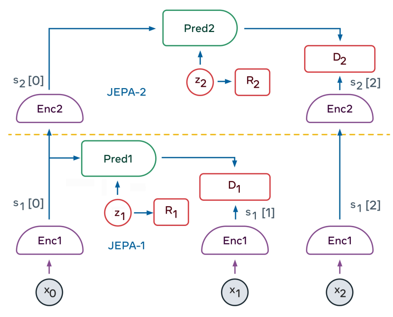 A estrutura hierárquica do JEPA pode ser usada para previsão em múltiplos níveis de abstração e em diversas escalas temporais. No entanto, para isso, ela precisará ser treinada tanto por meio de observação passiva (identificando autonomamente padrões no que está acontecendo) quanto por meio da interação com sistemas de nível inferior. Isso, aliás, torna a IA mais explicável — embora o papel de explicação aqui seja desempenhado por uma IA de ordem superior (fonte: Yann LeCun).