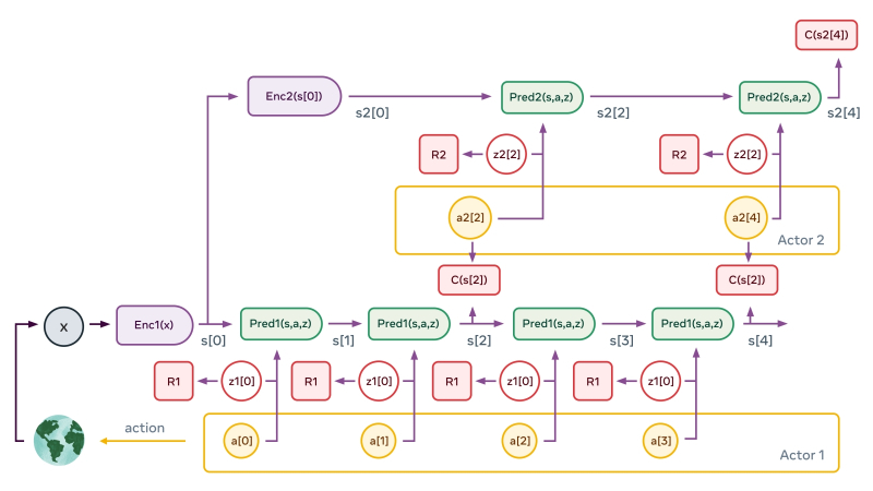 Dado um modelo de mundo com uma estrutura hierárquica JEPA devidamente treinada, um agente é (teoricamente) capaz de planejar hierarquicamente ações complexas, decompondo uma tarefa complexa em uma sequência de subtarefas menos complexas — e, ao mesmo tempo, mais práticas —, confiadas a agentes menos complexos; e assim por diante até as ações de nível mais baixo, cuja probabilidade de erro é mínima (fonte: Yann LeCun).