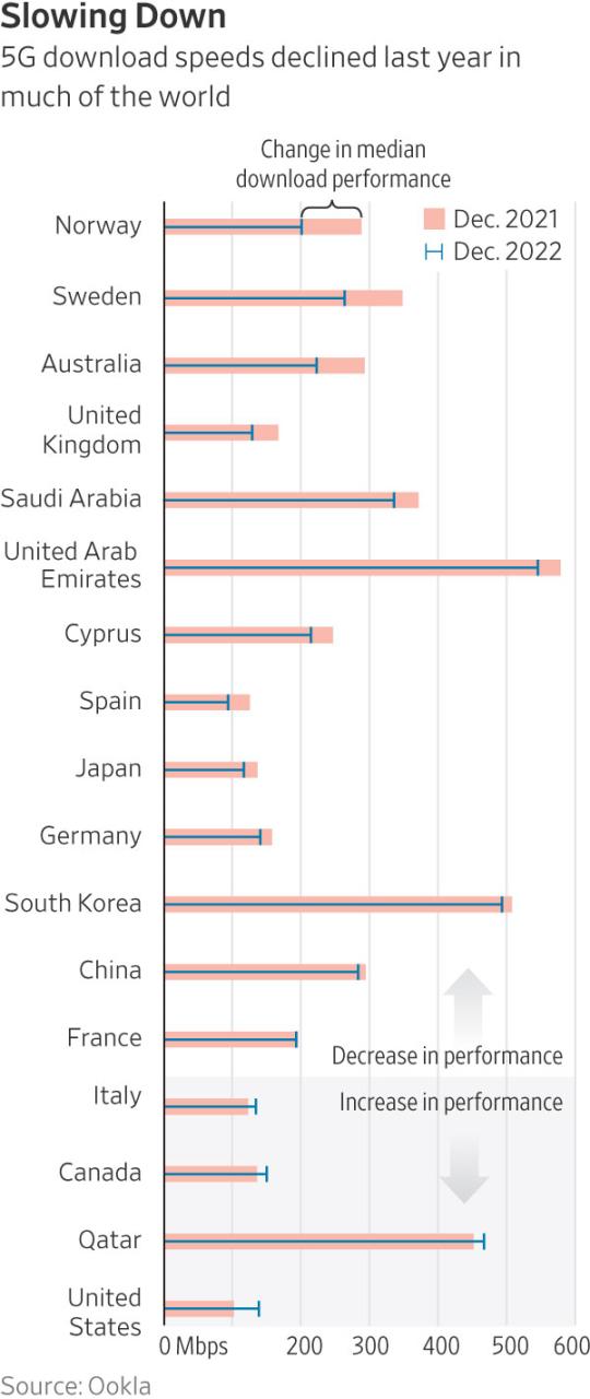 No ano passado, muitos mercados viram uma desaceleração nas velocidades 5G e houve pouco interesse na maioria dos aplicativos de consumo baseados nessa tecnologia, como a realidade aumentada. De acordo com a empresa de análise de dados Ookla, as velocidades médias de download 5G diminuíram no ano passado em muitos mercados, com as maiores quedas observadas na Noruega, Suécia, Austrália e Reino Unido. Os Estados Unidos foram uma exceção, onde, devido à modernização das redes das operadoras T-Mobile e Verizon, foi possível obter um salto significativo de velocidade nas redes 5G.
