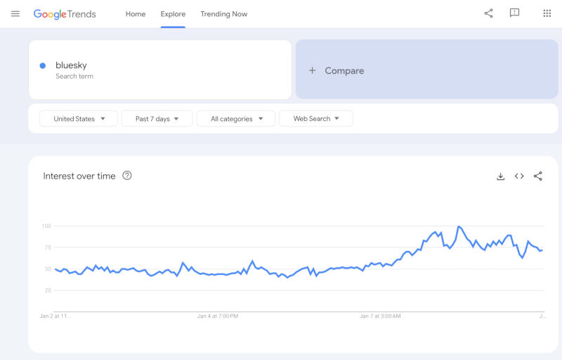 O Google também viu um aumento acentuado nas buscas por “alternativas ao Facebook✴”, bem como pelas plataformas descentralizadas Bluesky e Mastodon, cuja popularidade começou a crescer após a compra do Twitter (agora X) por Elon Musk.