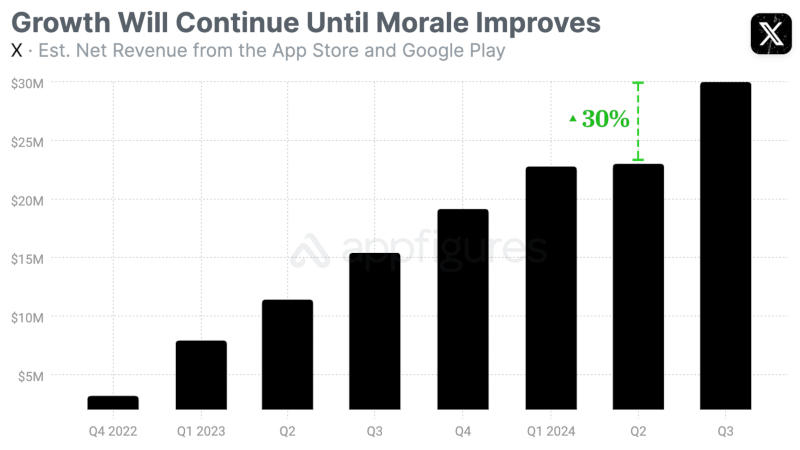 Como X é uma empresa privada, não é obrigada a divulgar o número de seus usuários e assinantes. Mas se assumirmos que esses fundos vieram apenas da assinatura X Premium mais cara disponível no aplicativo, então o número de usuários pagantes da plataforma é de 1,3 milhão; Se assumirmos que estes são apenas usuários X Basic com uma taxa de US$ 4, então o número de assinantes pagos é de 3,7 milhões. Na verdade, o plano mais popular é o Premium, seguido pelo Premium Plus, e o Basic é o menos popular. Supondo que 70% da receita venha do Premium, 20% do Premium Plus e 10% do Basic; então os usuários pagantes são distribuídos respectivamente em 940 mil, 134 mil e 368 mil. Com essa distribuição, em setembro, X conta com 1,4 milhão de usuários de assinaturas pagas. Curiosamente, do segundo ao terceiro trimestre, o volume de compras no aplicativo X aumentou 30%, de acordo com estatísticas do Appfigures.