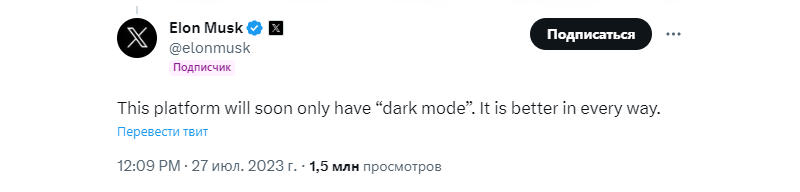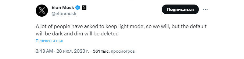 Como resultado, o empresário foi forçado a capitular. Ele escreveu que muitos pediram para manter o tema claro – a administração X o fará – mas o escuro será exibido por padrão e o escuro será removido. Agora a plataforma oferece um tema claro e dois temas escuros: “crepúsculo” com fundo cinza-azulado escuro e “noite” com fundo preto.