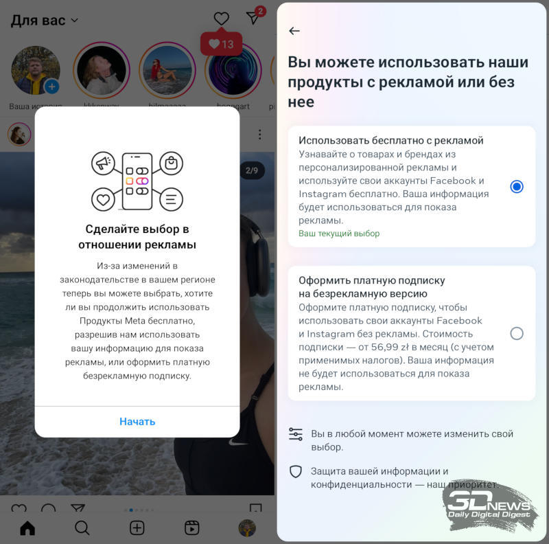 As aplicações Facebook✴ e Instagram✴ mostraram notificações aos residentes da UE com a opção de escolher como prefeririam continuar a utilizar estes serviços: consentiriam voluntariamente com a recolha de dados pessoais para lhes mostrar publicidade direcionada ou subscreveriam uma taxa mensal cancelar completamente a publicidade.