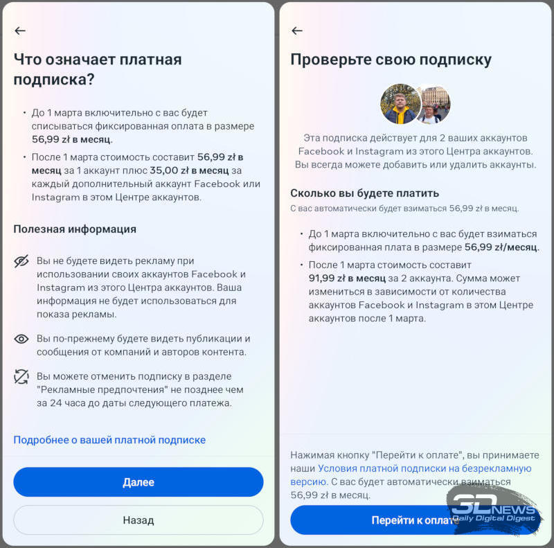 Por enquanto, a taxa de assinatura se aplica a todas as contas vinculadas no único “Centro de Contas” Meta✴. A partir de 1 de março de 2024, os valores acima serão cobrados apenas para uma conta numa plataforma, sendo que por cada conta adicional terá de pagar um adicional de 6€ ou 8€, dependendo da forma de pagamento. A assinatura é oferecida a usuários maiores de 18 anos.