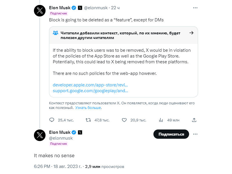Elon Musk anunciou que a função de bloquear usuários da forma usual pode desaparecer da rede social X (antigo Twitter). Isso pode violar os termos e condições definidos pela Apple App Store e Google Play para aplicativos com conteúdo gerado pelo usuário.