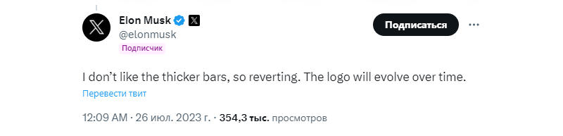 «Eu não gosto de linhas mais grossas, então vamos voltar. O logotipo evoluirá com o tempo”, tuitou Musk. Além da espessura das linhas, as duas versões do logotipo não apresentam diferenças. A versão atualizada do emblema já apareceu na página principal do Twitter e Musk a instalou em sua própria foto de perfil, mas o pássaro permanece no aplicativo móvel.