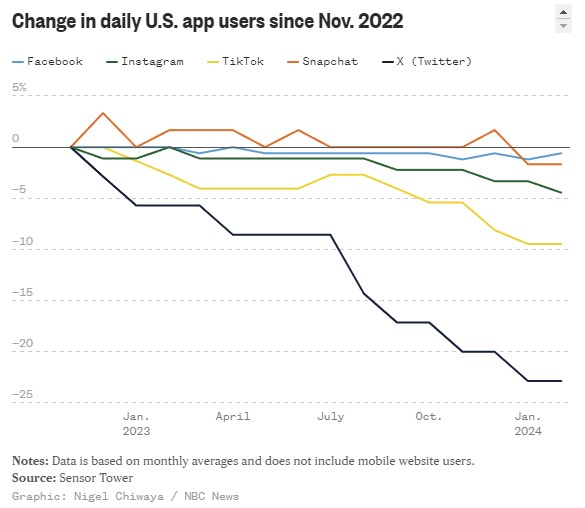 Num contexto de diminuição do número de utilizadores ativos do X, a audiência dos seus concorrentes está a crescer. Por exemplo, a base de usuários do Snapchat cresceu 8,8%, Instagram✴ 5,3%, Facebook✴ 1,5% e TikTok 0,5%, observaram dados da Sensor Tower.